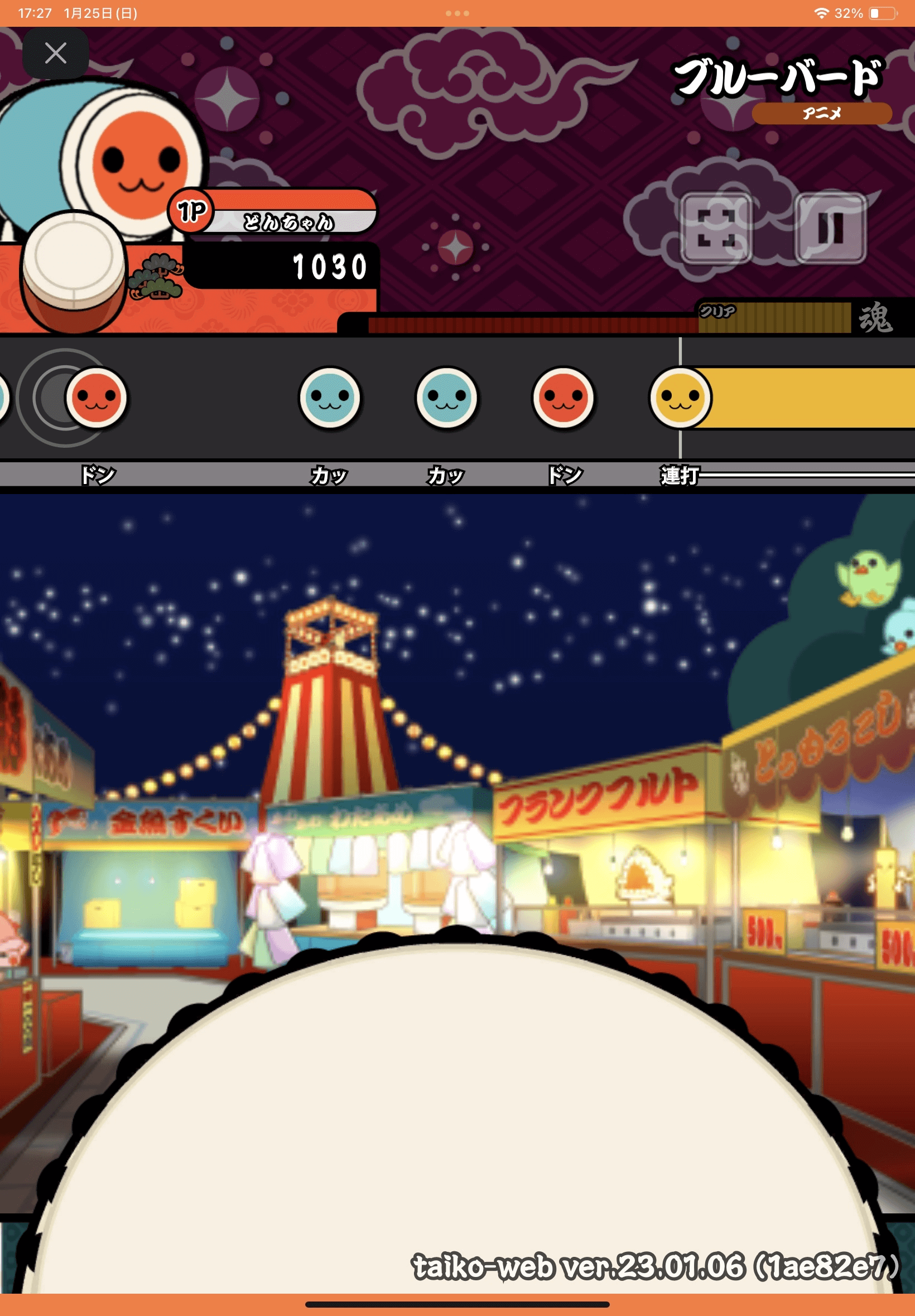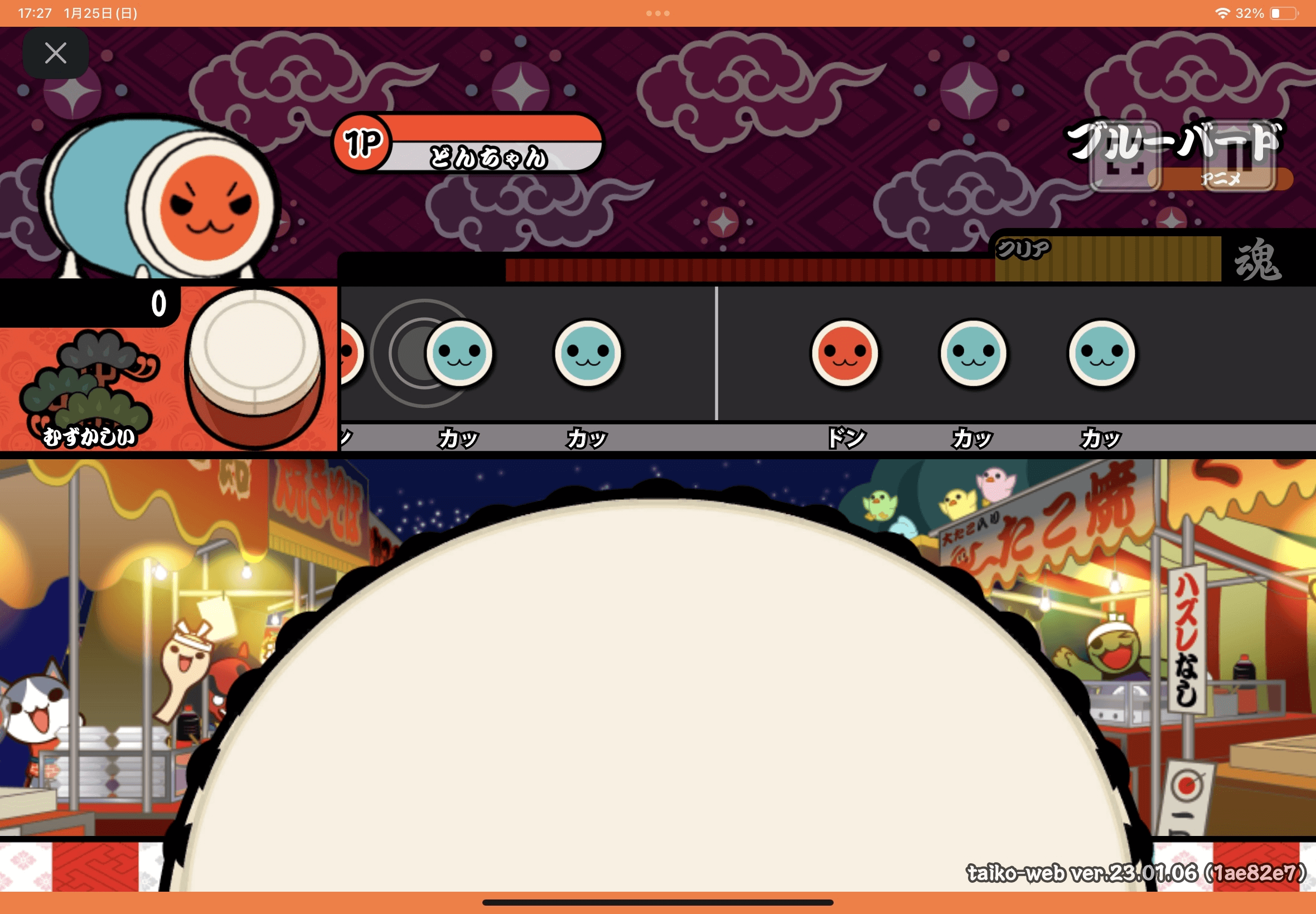 何も知らなかった自分は、「たぶん、太鼓さん次郎のweb版的な有志サイトだろう」と思って開いたら驚き。愛くるしいマスコットのドンちゃんや見覚えのある和風のUI、ゲーセンで聞き馴染みのある太鼓のSEなど、完全に公式のリソースで再現された本物と見分けのつかない太鼓の達人そのものが眼前に現れた。