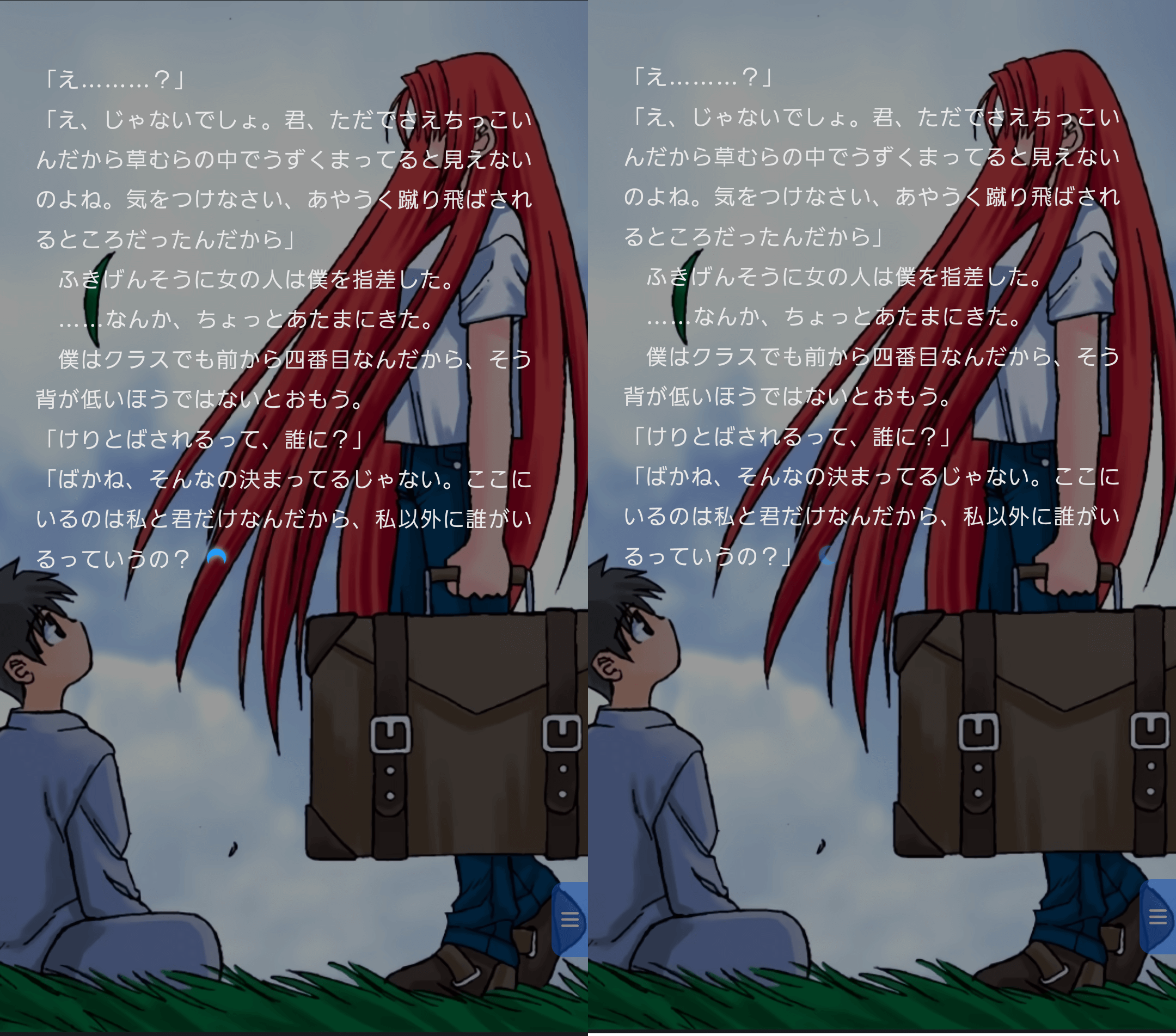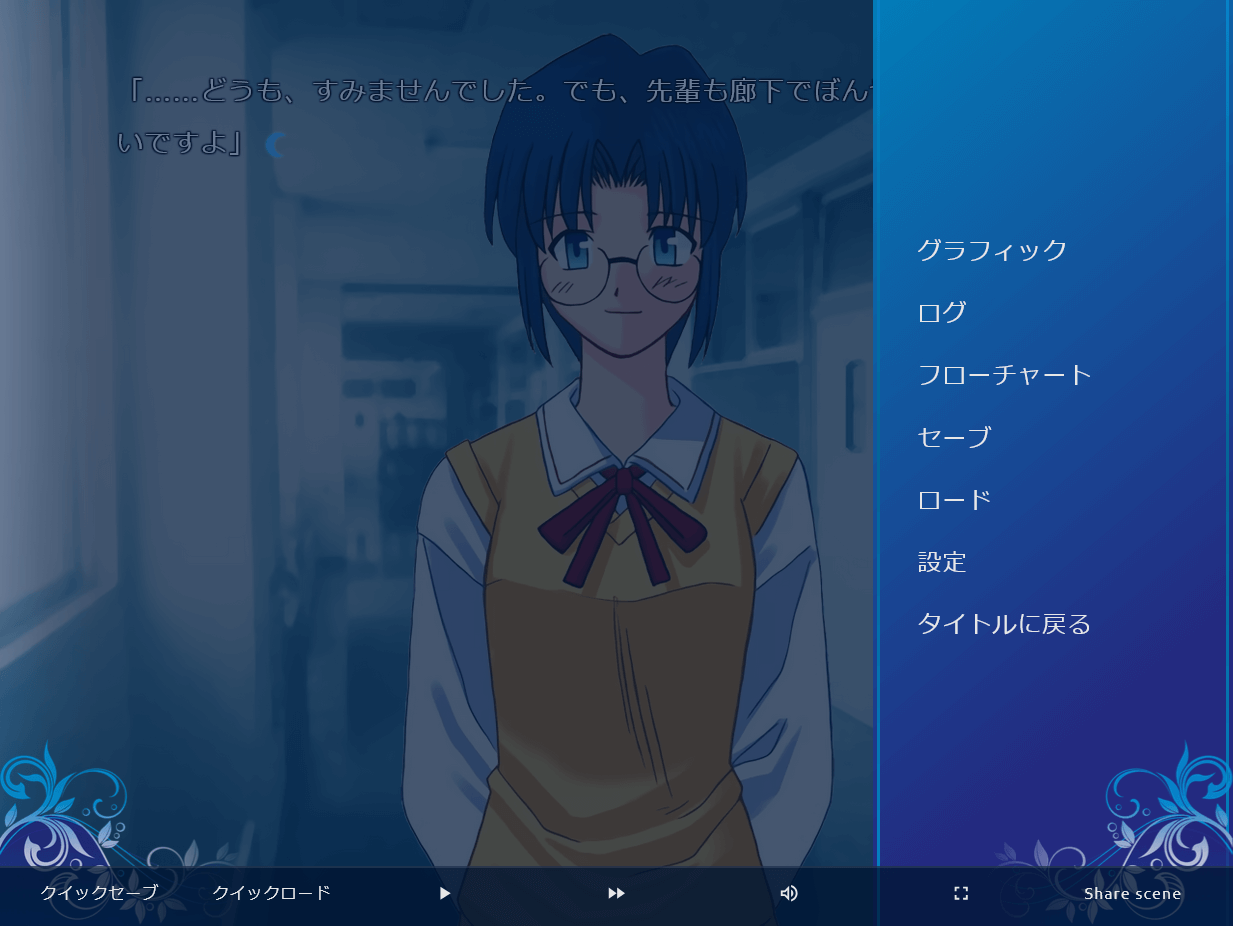 tsukiwebや既存のビジュアルノベルとは異なり、スクロールで文章を読み進めていく珍しい形式。スクロールで文字送りをすることができ、セリフにスクロールするとボイスが流れたり、エフェクトが表示される。個人的にはかなりやりづらい改変。