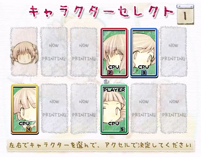 姉妹のキズナ Liens des soeurs▶ 🔊 サークル 春うらら リリース C68(2005年8月12~14日冬コミ) ホームページ http://www99.big.or.jp/~hidea/ 概要 ぷよぷよをベースにオリジナルのルールが加えられた落ち物パズルゲーム。フルボイスのストーリーやネット対戦などボリュームが多く、CPU対戦の難易度が高いため、ぷよぷよ好きならより楽しめる作品。 ▼タイトル画面 【あらすじ】 代々、落ち物パズルゲームの勝敗で生徒会役員を決めてきたリリアン女学園。祥子と令にも遂に生徒会役員”戦”の時期が迫ってきていた。来るべき勝負の日に備え、ある者は姉の力になるために、ある者は苦手を克服するために手当たり次第に落ち物パズルゲーム対決を挑む。 ▼対戦画面 【システム】 一見普通のぷよぷよだがいくつかのオリジナル仕様が追加されており、落ちてくるのはキャラクターの顔とそれに対応する薔薇の色のドロップ(所謂ぷよ)。特殊ルール1:通常のぷよぷよであれば同じ色のぷよを4つ並べると消すことができるが、本作では4つ以上かつ、同色で2人以上のキャラのドロップが接着したときに限り消すことが出来る。例えば、赤い祐巳のドロップが4個以上接着していても消えず、そこに赤の祥子か蓉子のドロップが接着することで消すことが出来る。 特殊ルール2:おじゃまぷよの代わりに画面下からギフトが発生する。ギフトに接地するドロップを消すことでギフトの中からドロップが出現する。これを利用して連鎖を組むことで逆転が狙える。特殊ルール3:いくつものアイテムが存在し、速度アップや相手の妨害など様々な特殊効果を持つ。 ▼ストーリー画面 【ストーリーモード】 祐巳ら一年組と祥子と令の二年生組それぞれが主人公の5つのストーリーが選べる。一部のシナリオでは対戦の勝敗によりストーリーの分岐が発生する。「魁!!クロマティ高校」のマスクド竹之内に似た「マスク・ド・キネンシス」が登場するなどコメディ寄りのシナリオ。 ▼祥子対マスク・ド・キネンシス 【その他モード】 フリー対戦では好きなキャラクターで対戦が可能。チャレンジコースは全キャラ総当たりの12連戦。次第に難易度が高くなり、ラスボスのマペットユミを倒すとキャラクターセレクト時に使用できるようになる。ネット対戦も可能。パッドコンフィグやCPU対戦難易度選択、ローカル対戦モードがパッチにより追加されているが現在は入手不可。 ※この記事はチヘド劇場がC104で頒布した「マリア様がみてる 同人ゲーム録本」を編集したものです。2025-02-12 サークル: 春うらら 原作: マリア様がみてる ジャンル: ノベル, パズル リリース: 2005年, C68 -