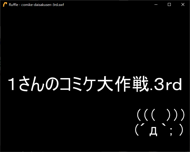 1さんのコミケ大作戦.3rd▶ 🔊 サークル ばーちゃる・ちゃねる リリース 2002年12月C63 冬コミ ホームページ http://www.geocities.co.jp/AnimeComic/8742/ 概要 ゲームじゃなくてFLASHアニメだった。 途中にクリックが必要な場面はあるがやっぱりゲームではない。 駿河屋ちゃんと仕事しろ。 過去作の「( ´_ゝ`)流石フーンの転売大作戦(´<_` ) 」のおまけつき。 内容 自分はAA界隈ネタはおろか、2ちゃんねるについて無知で分からないことが多いが、 FLASHアニメと聞いて想像するアレで間違いない。 ジャケット2024-11-11 サークル: ばーちゃる・ちゃねる 原作: 2ちゃんねる ジャンル: 非ゲーム, FLASH リリース: 2002年, C63 -